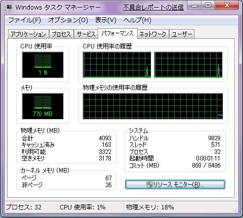 起動時のメモリ使用量は800MB前後